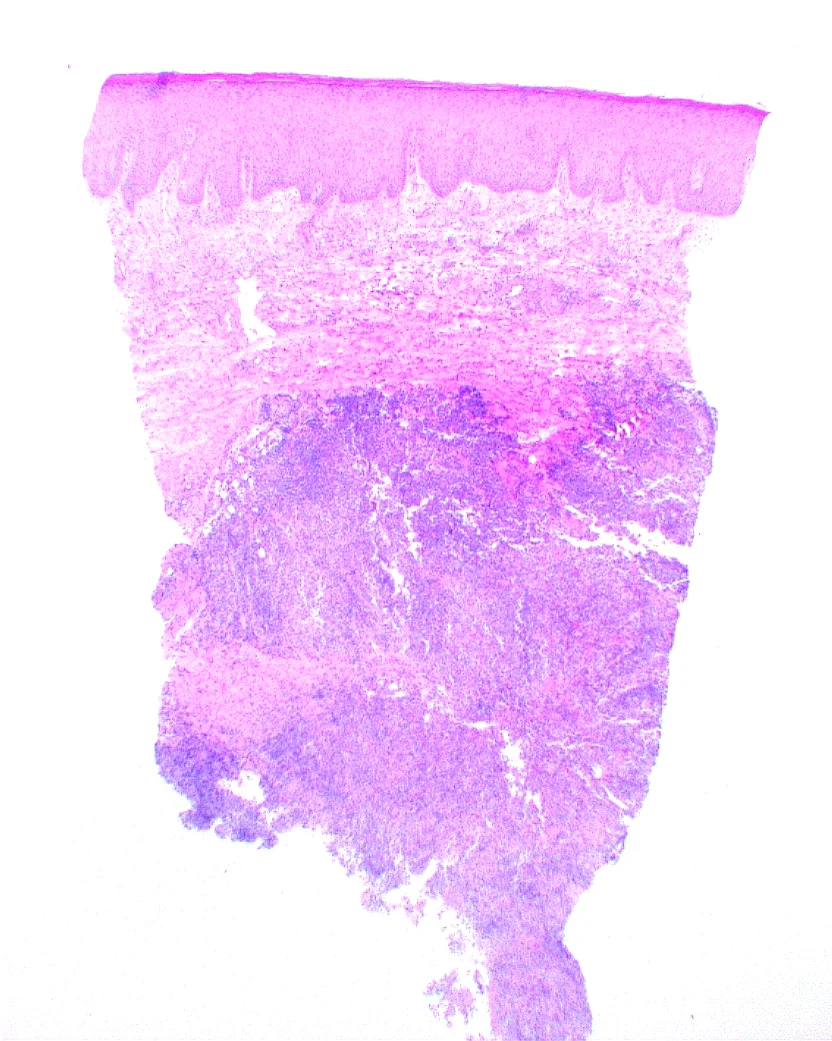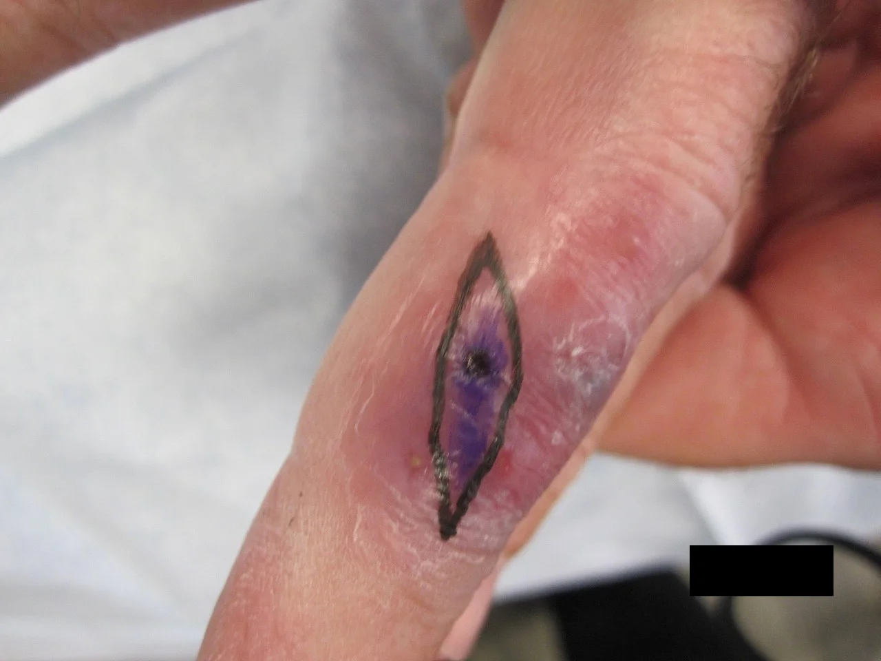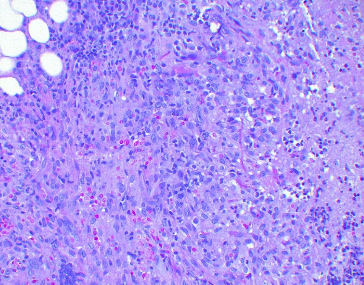 62 year old male. Acute swelling of right index finger. 6 months ago had triamcinolone injection into digital mucous cyst in same finger with good response. Failing response to bacterial antibiotics a biopsy was taken for histology and culture.