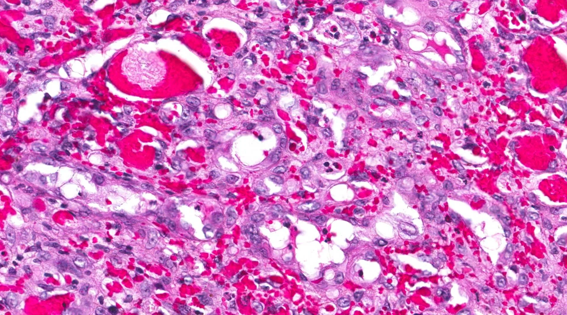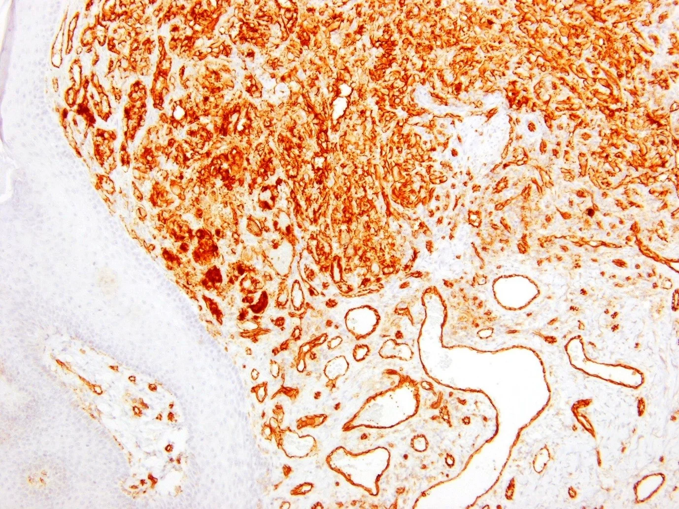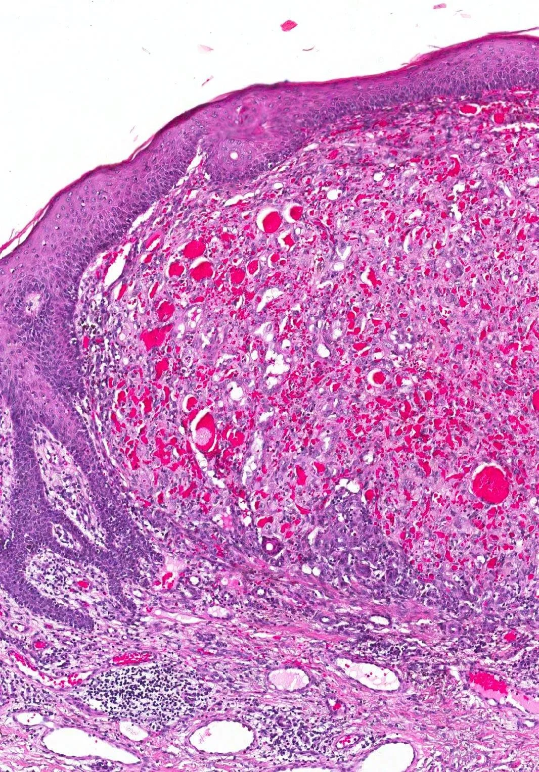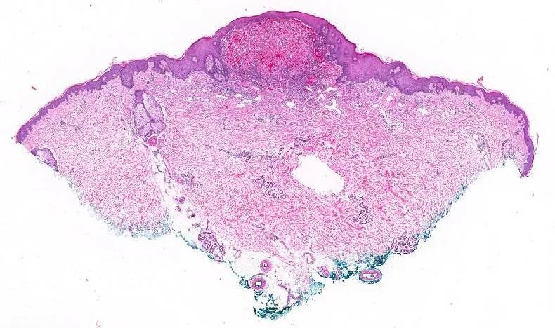 Clinical history: Male age 72. Tumour excised from the abdomen. The dermatologist suggested melanoma, BCC or a metastasis.